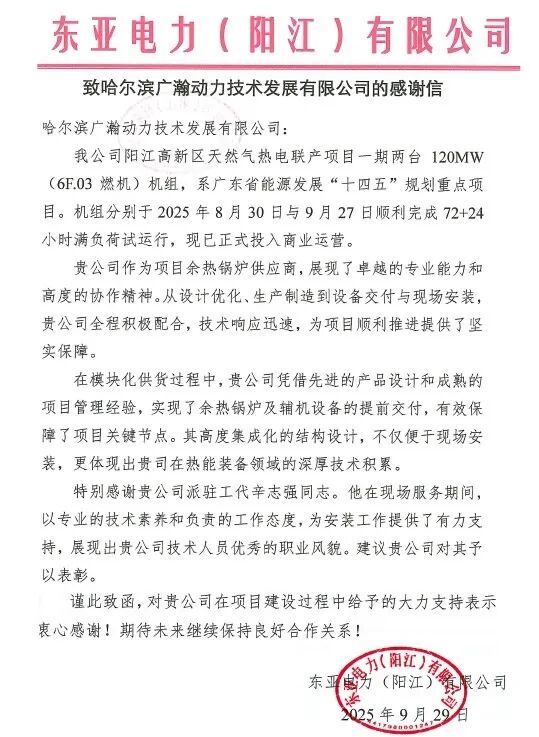 近日,由哈尔滨广瀚动力技术发展有限公司承接余热锅炉设备供货的阳江高新区天然气热电联产项目一期两台机组顺利完成“72+24”小时试运行,高标准通过验收并实现高质量“双投”。项目业主东亚电力(阳江)有限公司专门发来感谢信,对七〇三所展现出的专业技术实力与高效履约能力给予赞扬。