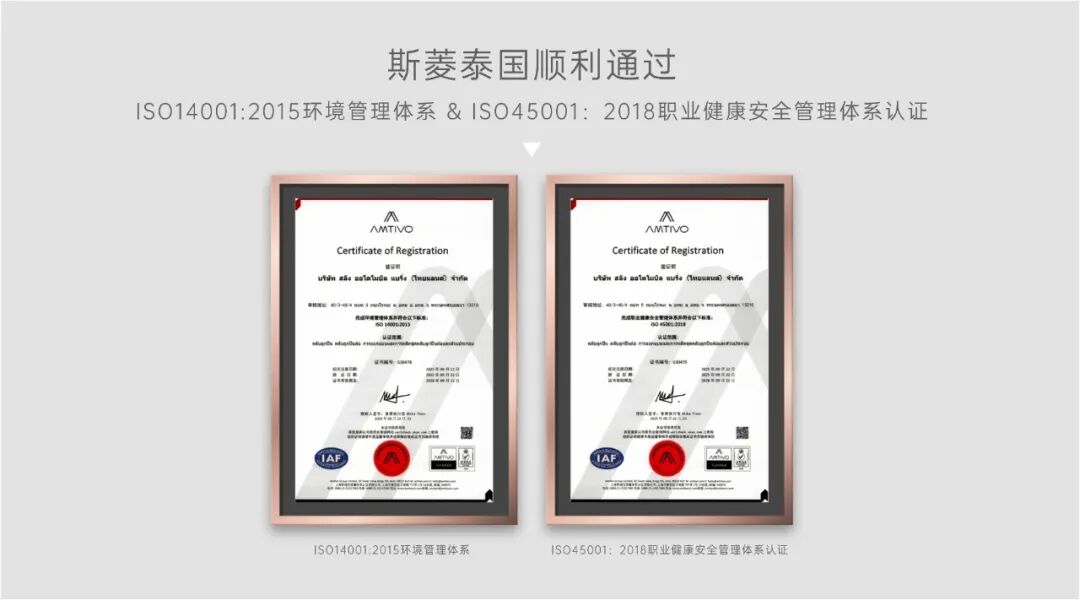 近日,斯菱汽车轴承(泰国)有限公司成功通过了ISO 14001:2015环境管理体系与ISO 45001:2018职业健康安全管理体系的国际认证审核。