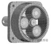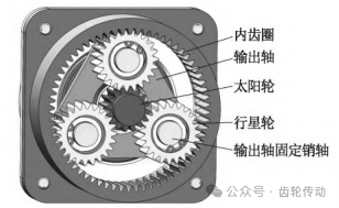 小模数行星减速器的基本原理:小模数行星减速器是一种由太阳轮、多个行星齿轮以及一个内齿圈共同协作实现减速效果的机械装置。某行星减速器结构示意图如图1所示,太阳轮和行星轮之间的啮合使得行星轮随之旋转,并绕行星架旋转,将输入轴的高速旋转转变为输出轴的低速旋转,并起到增大扭矩的作用。输入轴与太阳轮采用一体式设计或者机械固定方式,行星轮个数为3个,其在自转的同时也围绕行星架公转,所以其承载能力强、传动精度高、传动比大。