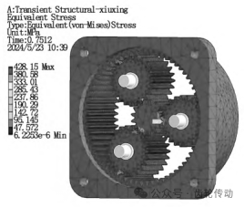 齿轮修形生成新的太阳轮、行星轮和内齿圈,然后得到新的行星轮系模型。本文采用有限元软件ANSYS Workbench对该行星轮系进行瞬态动力学分析,以快速验证齿轮修形后的效果,此方法不仅可以节约时间成本,对于方案快速迭代也非常有利。对模型的网格划分、施加约束与边界条件等与优化前相同,分析后获得了行星轮系啮合齿处的应力分布图,如图7所示。其中最大应力出现在与太阳轮啮合的行星轮齿根处,其最大应力σmax=428.15MPa, 20CrMnTi的屈服强度为850MPa, 安全系数为1.99。 其承受的最大应力降低了16.4% , 在材料一定的情况下,经过齿轮修形的行星减速器其承载能力更强。