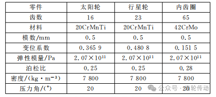 根据某减速器工况,其额定输出转矩为10N·m, 输出转速为120r/min , 使用专业齿轮设计软件KISSsoft进行齿轮设计,齿轮的关键参数如表1所示,行星减速器的单级减速比i1=1+z3 /z1=1+65/16=5.063, 其中z3为内齿圈的齿数,z1为太阳轮的齿数。
