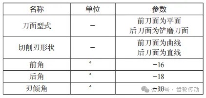 在弧齿锥齿轮硬齿面高速切削过程中,主要采用数控机床进行加工,机床加工中刀具是关键的加工设备。关于刀具,无论是刀具材料还是几何参数都很重要,考虑到本次试验采用的是淬硬钢弧齿锥齿轮,本文选择了粉末冶金高速钢刀具。粉末冶金高速钢具有高纯净度、高强度和高硬度的特性,其在实际应用中具有耐磨性好、能够制造复杂刀具、节约材料和成本、可加工性好、高效率、长寿命及环保等优势。因此,在制造业中,特别是对于需要高精度、高强度和高耐磨性的刀具制造领域,粉末冶金高速钢是一种非常理想的材料。本次弧齿锥齿轮硬齿面高速切削试验选择粉末冶金高速钢刀具作为主要切削设备,其具体的设计参数如表2所示。