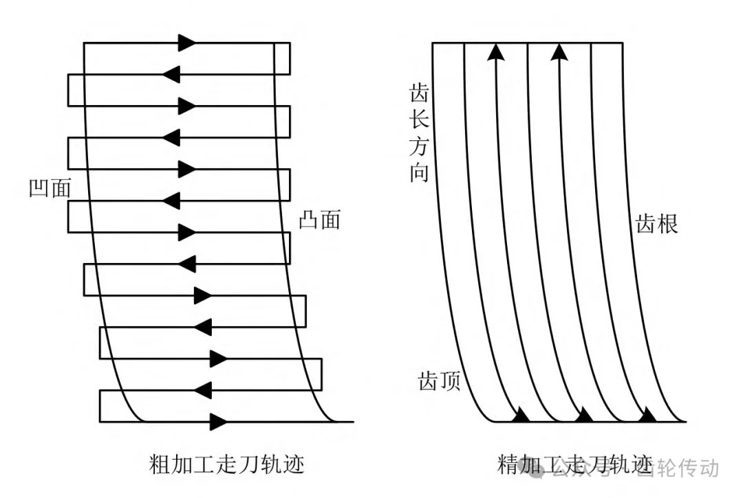 从表3可以看出,为探究切削力、切削速度和进给量这三个高速切削工艺参数与弧齿锥齿轮硬齿面表面质量之间的关系,本次试验采用了三因素六水平正交试验方法。具体试验步骤如下:首先开启机床,控制弧齿锥齿轮工件移动至与刀具相对的正确位置上,按试验方案中设计的切削工艺参数进行齿轮的粗加工。这里主要采用双向行切法,也就是控制刀具从弧齿锥齿轮的毛坯工件上端的凹面处进刀,绕着工件圆周方向进行切削,直至走到下一齿的凸面,完成一个齿长的切削,不断循环,直至完成全部齿槽的粗加工后停止。然后在弧齿锥齿轮工件热处理后,再对齿轮进行精加工。这里主要采用了竖向双向行切法,也就是按照与粗加工不同的走刀路径,同样对弧齿锥齿轮工件进行由凹面到凸面的切削加工,最终得到弧齿锥齿轮硬齿面的实际切削效果。在本次试验过程中,弧齿锥齿轮硬齿面的粗加工与精加工轨迹如图1所示。表面质量之间的关系,本次试验采用了三因素六水平正交试验方法。具体试验步骤如下:首先开启机床,控制弧齿锥齿轮工件移动至与刀具相对的正确位置上,按试验方案中设计的切削工艺参数进行齿轮的粗加工。这里主要采用双向行切法,也就是控制刀具从弧齿锥齿轮的毛坯工件上端的凹面处进刀,绕着工件圆周方向进行切削,直至走到下一齿的凸面,完成一个齿长的切削,不断循环,直至完成全部齿槽的粗加工后停止。然后在弧齿锥齿轮工件热处理后,再对齿轮进行精加工。这里主要采用了竖向双向行切法,也就是按照与粗加工不同的走刀路径,同样对弧齿锥齿轮工件进行由凹面到凸面的切削加工,最终得到弧齿锥齿轮硬齿面的实际切削效果。在本次试验过程中,弧齿锥齿轮硬齿面的粗加工与精加工轨迹如图1所示。