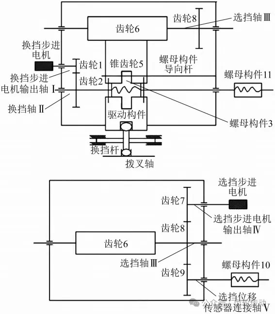工作原理:选挡步进电机启动旋转,带动与其相连的齿轮7转动,通过与齿轮8的啮合,使选挡轴转动。选挡轴上的齿轮6与锥齿轮相互啮合,使锥齿轮旋转。锥齿轮的下部通过螺钉与驱动构件相连,驱动构件转动,带动换挡杆旋转。最终,换挡杆下端的球头沿垂直于纸面方向移动至相应的拨块槽中,完成选挡操作。在选择挡位的同时,通过齿轮7、8、9的啮合使选挡位移传感器连接轴转动,带动螺母构件10移动。螺母构件10上的传感器将位移信号转换为电信号,并传递给控制器。挡位选择完成后,控制器根据来自选挡位移传感器的信号,分析并发出换挡控制信号至换挡步进电机。换挡步进电机启动旋转,通过换挡步进电机输出轴带动齿轮1转动。齿轮1与齿轮2啮合,齿轮2旋转,带动换挡轴旋转。换挡轴旋转,通过螺旋副推动螺母构件3移动。螺母构件3的上部开有槽,与螺母构件导向杆构成移动副,由此螺母构件3仅能沿轴向移动。螺母构件3的中间有凸缘,嵌入驱动构件和锥齿轮的槽中,从而推动驱动构件移动,使换挡杆沿轴向移动。换挡杆上的球头拨动拨块,进而带动拨叉轴沿轴向移动,最终完成挡位更换。螺母构件3、10、11均为带梯形内螺纹的螺母构件。