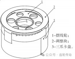 摆线轮的外协最后一道工序为热处理,粗加工给精加工的端面预留量为0.1mm,由于热处理后工件会不可避免的发生变形,如果精加工采用直接吸在磨床上进行平磨,会导致工件的形位公差超差,进而影响后续的工序加工。因此,需要设计一套工装(图3)来完成此工序的加工。此工装利用标准的三爪卡盘改造,只需更换特制的卡爪即可,摆线轮在装夹时,需保证每个卡爪的圆弧面与2个以上的摆线齿接触。图中的调整块可以快速的调整摆线轮装夹时的平面度,摆线轮夹紧后取掉调整块进行磨削加工。工装的夹紧力控制在5N·m,工件在装夹后几乎不会发生弯曲变形,可以保证摆线轮在第一面磨削完成松开后,加工面不会发生弯曲变形,磨第二面时便可以将第一面直接吸在磨床平台上即可,不需要互为基准的多次磨削。要求平磨后摆线轮两平面的平行度为0.01mm。