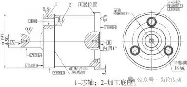 磨齿工装芯轴的粗加工和热处理采用外协的方式完成,公司内部只完成芯轴的精加工,芯轴的精加工也是摆线轮工艺装备中最关键的一环。芯轴材质为低碳钢,热处理工艺采用渗碳淬火+低温回火,热处理后要求表面硬度为58~62HRC,芯部硬度为30~45HRC,渗碳时需要对孔及其周围的区域(比孔最终尺寸+φ4mm)进行防护,目的是热处理后需要镗孔加工的区域的表面硬度与芯轴内部保持一致,精加工时有利于保证加工质量,加工完成后孔周边的表面硬度还可以满足工装的使用。芯轴本体的形状不便于进行镗孔加工,因此精加工时还需设计一个芯轴加工底座,来辅助完成芯轴镗孔时的定位装夹。芯轴粗加工完成到货后,先将其中心孔精研,提高定位基准的质量,因后续的工装加工以及摆线轮加工都是以中心孔为基准。将芯轴与底座的配合面精磨,要求对中心孔的跳动≤0.001mm,然后与底座安装在一起后进行精加工(图7)。 图中的关键尺寸按图所示加工。为了防止芯轴在镗孔夹紧时发生变形导致加工精度超差,底座底部设计并非是一个大的圆环面,而是设计为半径方向厚4mm左右的圆环状,并且要精磨成内凹的形状。这种设计是为了保证在压紧时工装与机床工作台面为线接触,这样芯轴在夹紧后不会发生变形。