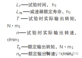 GB/T37718—2019规定减速器的额定寿命不低于6000h。这是绝大多数减速器的额定寿命,也是整机OEM要求的减速器工作时间,因此油品测试周期应满足减速器6000h寿命要求。同时该标准中规定了对应6000h寿命的台架试验时间——减速器当量寿命的计算方法,可据此结合台架实际参数计算出试验时间。其当量寿命(即试验时间)按照下述公式计算: