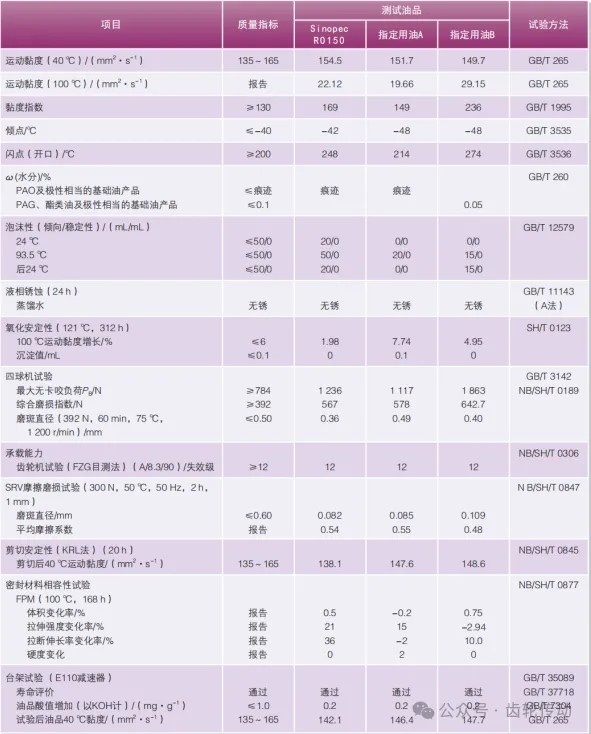 表1中所列的测试项目中,台架试验(E110减速器)是针对机器人关节减速器的特征性台架,能良好地反映油品的性能差异。