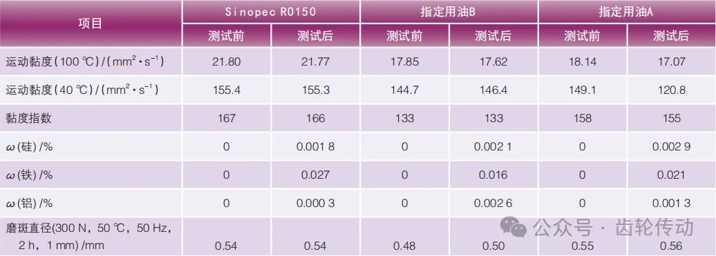 试验前后油品的理化性能见表3。由表3可以看出,试验后Sinopec RO150和指定用油A、B的黏度等级都在150黏度范围内,杂质元素和磨损金属元素含量增加量在合理范围内。